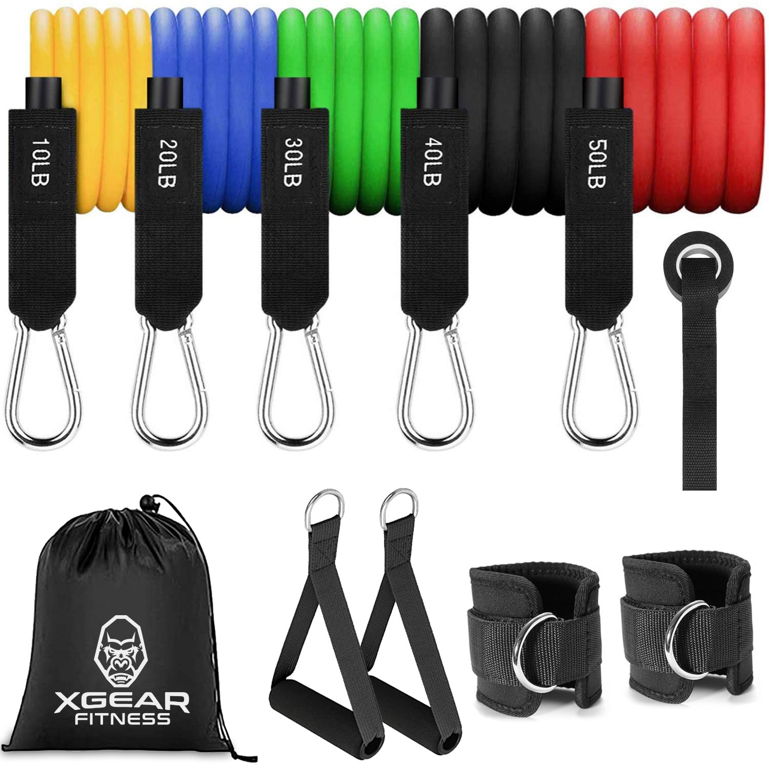 • Complete Resistance Band Set: Includes five exercise bands, one door anchor, two cushioned handles, storage bag and a user manual.